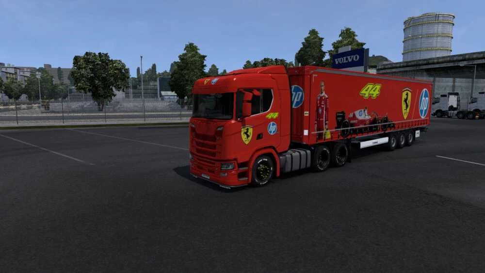 Pakiet Ferrari Scania S i Profiliner Skin nadaje Twojemu modelowi Scania S agresywny i ekskluzywny wygląd inspirowany Ferrari, idealnie pasujący do przyczepy Profiliner.