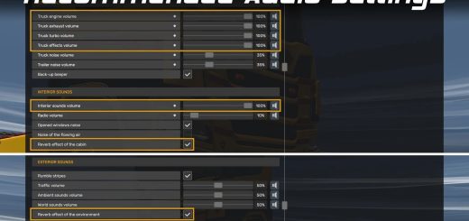 Połączono wybrane dźwięki kabiny z podstawowej wersji gry (1.55) z przeróbkami Sound Fixes Pack dotyczącymi dźwięków zawieszenia wnętrza ciężarówki.