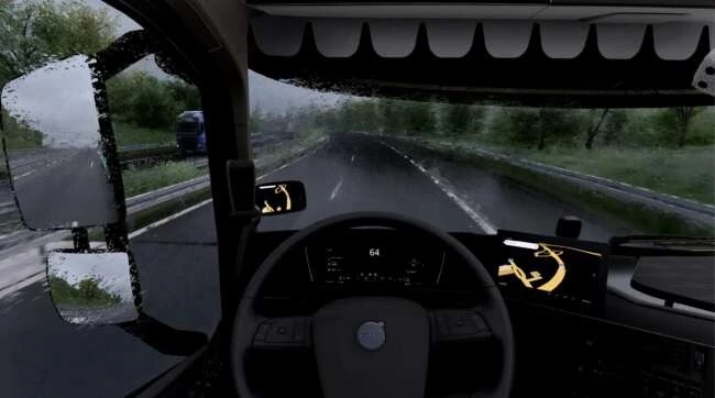 Woda perli się i spływa po szybie w realistyczny sposób, zwiększając widoczność i immersję, zwłaszcza przy prędkościach autostradowych.